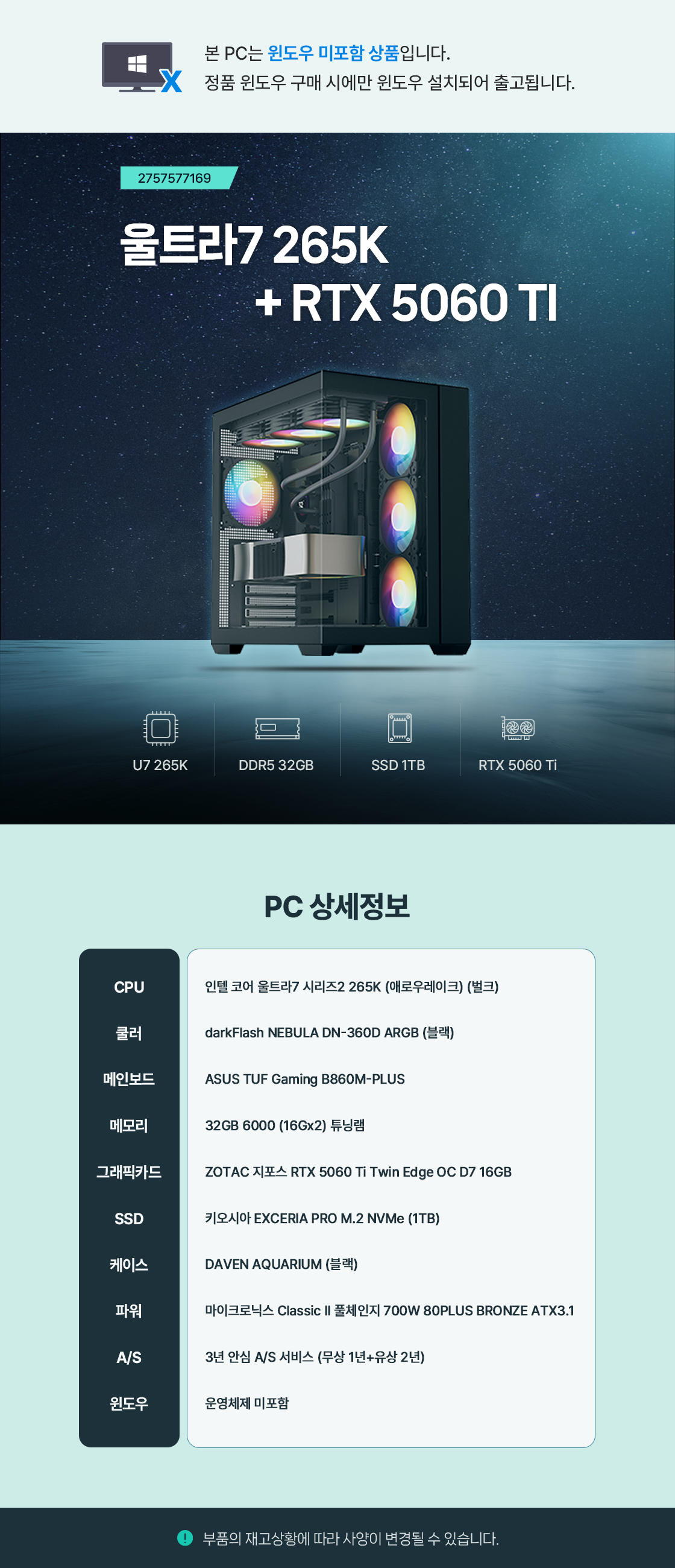 쥐씨 인텔 울트라7 265K + RTX 5060 TI 16GB 대표 조립컴퓨터